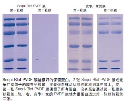 具化学抗性的 PVDF 膜用于蛋白研究,用于 Edman降解(N-端)测序。由于 PVDF 膜有很高的蛋白结合能力,而且在多次洗脱和重新杂交后仍能避免撕裂和脆裂,长期以来它一直作为 western 印迹杂交膜。Bio-Rad 为用户提供了特别为蛋白测序和转印设计的 PVDF 膜。所有 Bio-RadPVDF 膜的孔径均为0.2μm。
