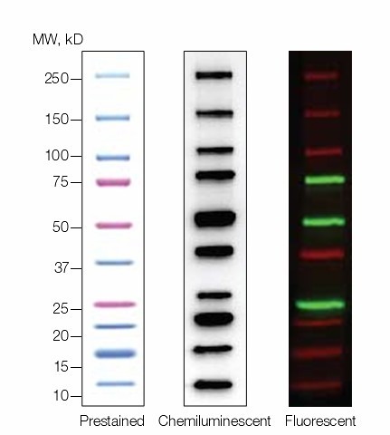 清晰、明亮,预染的12条蛋白带可精确的进行分子量确定;