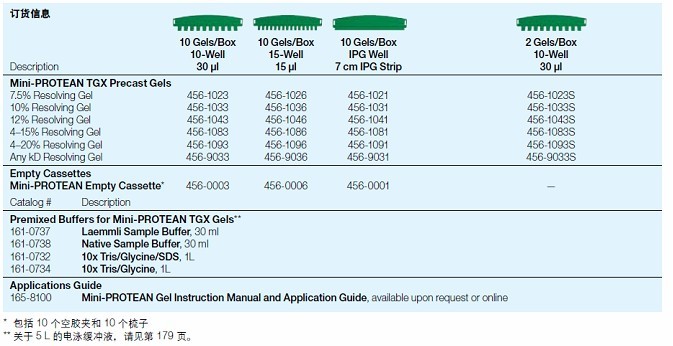 保质期更长的 Mini-PROTEAN TGX 预制胶为创新的凝胶系统,使用标准的Tris/甘氨酸电泳缓冲液可提供类似Laemmli的分离模式。Mini-PROTEAN 胶兼容 Mini-PROTEAN Tetra (1-4块胶) 和 Dodeca 电泳槽(1-12 块胶),这类胶还可用于 Mini-PROTEAN 3 电泳槽,同时提供转印用Mini Trans-Blot 电泳槽和预切膜三明治。