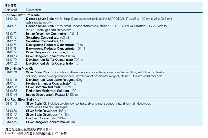 银染Plus 是最灵敏、使用最简便的银染色剂。银染Plus 试剂盒源于Gottlied 和Chavko(1987)所开发的检测琼脂糖凝胶上天然和变性真核DNA的方法。该试剂盒经化学改进,可用于检测聚丙烯酰胺和琼脂糖基质上的蛋白和核酸。